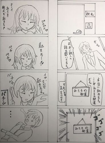 四コマてす! 左〜右の順にみてください。 ややこしくてすみません。 ここから後書きになりますので興味のない方は飛ばしてください。 みさきを描いてて気づいたんですが、アイドルマスターの亜美真美に似てる… 真似したんじゃあないんだけどなぁ。っと思い…